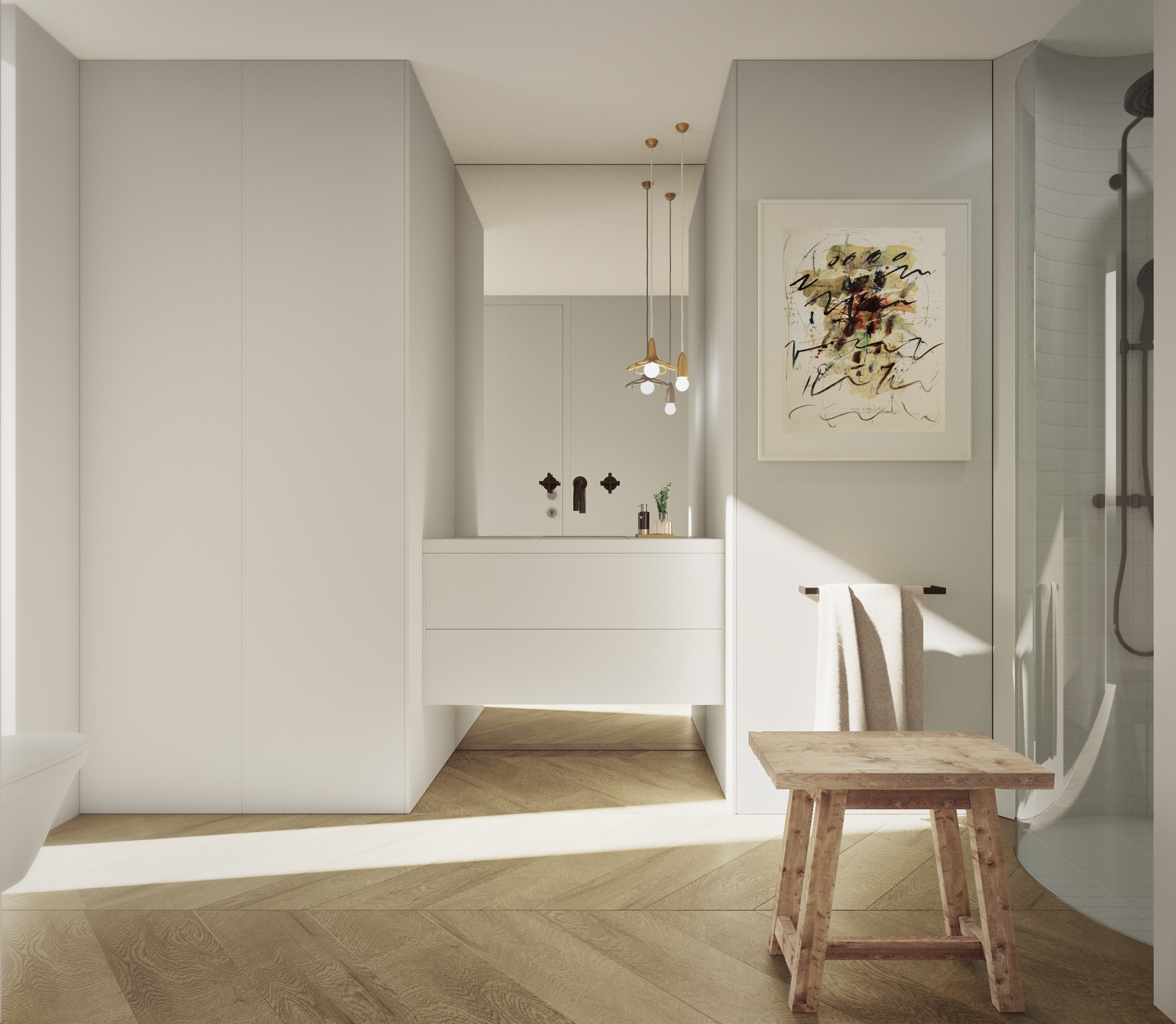 Our renderings were used during the whole design process to see the different possible combinations of how to arrange the furniture, surfaces, and colours. Last but not least, we created a set of VR panoramas of the completed and newly designed flat.